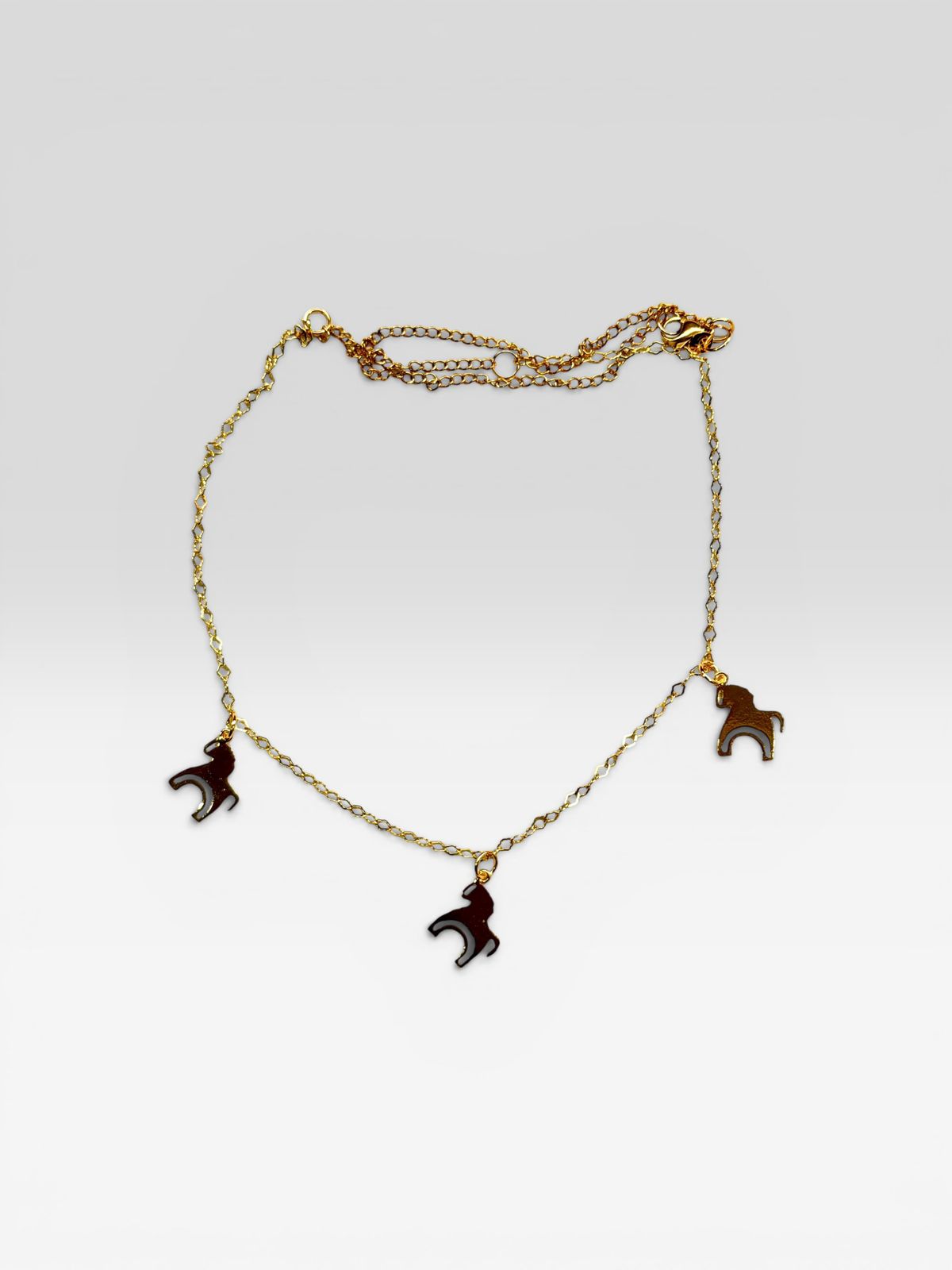Cadena con tres caballitos de Cartujana que representan la fuerza que habita el alma: Paciencia (la fuerza que sabe esperar), Valentía (el impulso de avanzar sin miedo) y Discernimiento (la sabiduría para elegir el camino correcto).